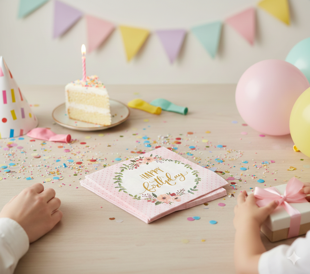 Idéales pour célébrer un anniversaire inoubliable, ces serviettes en papier associent avec finesse un charme champêtre et une élégance contemporaine. Leur design exclusif se distingue par une délicate couronne de fleurs aux tons saumon et terracotta, entrelacée de feuillages verdoyants sur un fond rose poudré parsemé de fins pois dorés. En son centre, l'inscription « Happy Birthday », tracée dans une calligraphie dorée scintillante, illumine votre décoration avec raffinement.