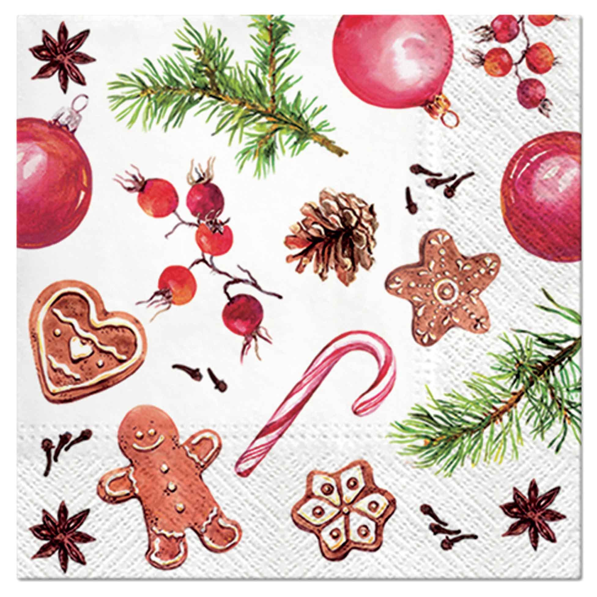 Sur un fond clair délicatement texturé, les éléments se répondent avec harmonie : biscuits en pain d’épices aux formes ludiques, canne de sucre rouge et blanche, branches de sapin fraîchement coupées, pommes de pin naturelles et baies rouges éclatantes. Les décorations de Noël, aux teintes rouges profondes, apportent une touche festive et lumineuse, tandis que les épices – anis étoilé et clous de girofle – évoquent instantanément les parfums des fêtes de fin d’année.