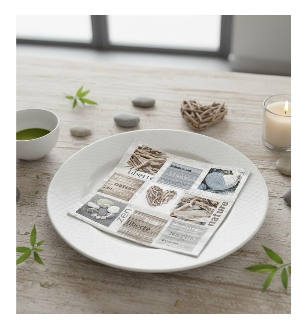 Ces serviettes en papier invitent à l’évasion et au calme avec leur composition graphique mêlant bois flotté, galets, textures minérales et mots évocateurs. Les nuances naturelles de beige, gris et bois clair créent une atmosphère douce et apaisante, idéale pour une table élégante et ressourçante.