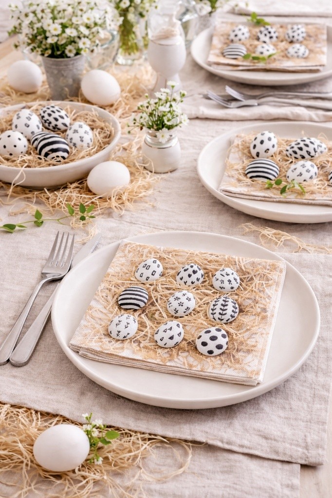 Ces serviettes en papier revisitent l’esprit de Pâques avec une approche résolument contemporaine. Illustrées d’œufs décorés de motifs graphiques noirs et blancs – pois, rayures, formes géométriques et végétales – elles apportent du caractère et du rythme à la table tout en conservant une grande douceur visuelle.