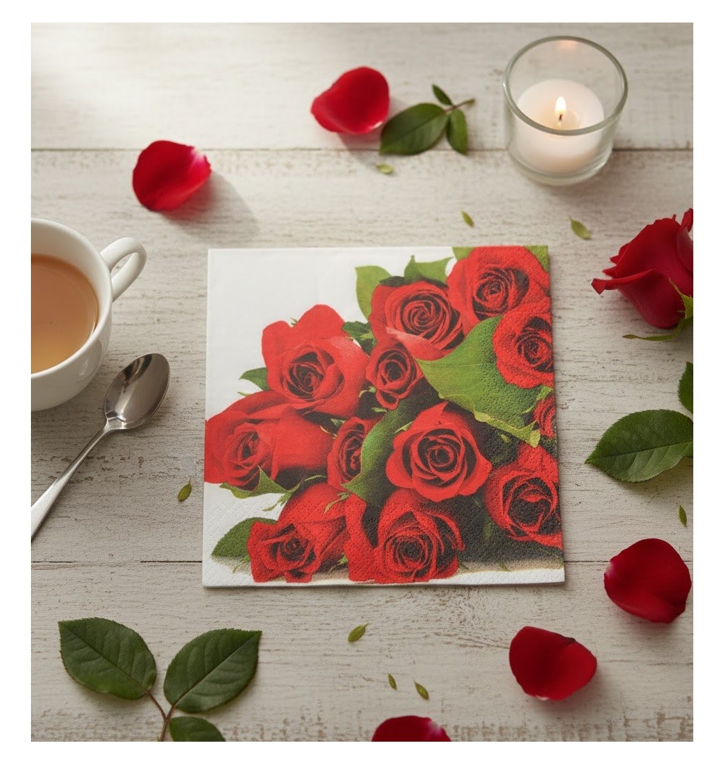 Ces serviettes en papier apportent une touche de romantisme et d’élégance à la table avec leur somptueux motif de roses rouges en pleine floraison. Intenses et profondes, les fleurs se détachent délicatement sur un fond clair, créant un contraste raffiné et chaleureux qui attire immédiatement le regard.
