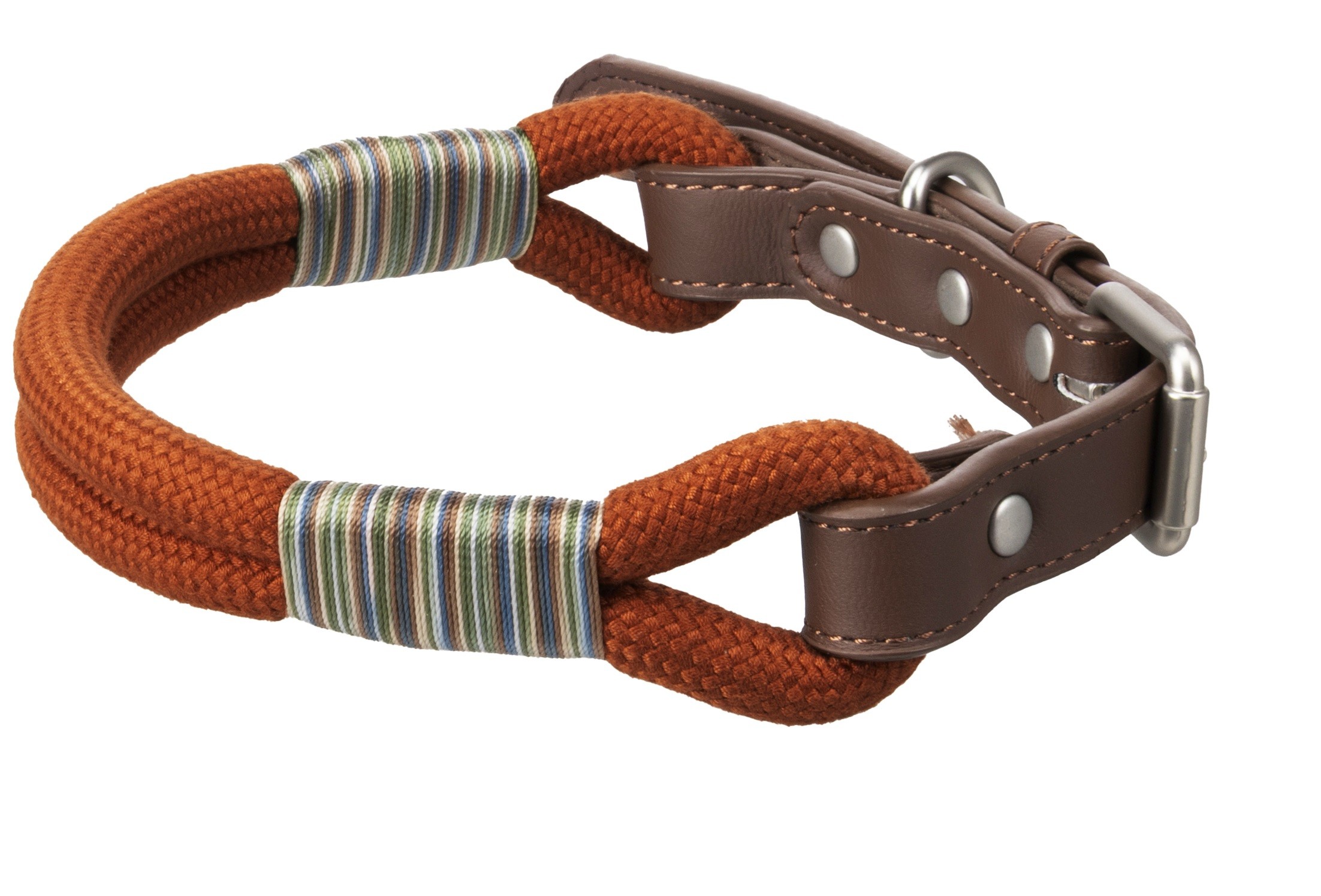 Conçu en similicuir et nylon le collier Athos est agréable à porter tout en offrant une excellente durabilité. Sa sangle résistante est complétée par une corde textile décorative apportant une touche moderne et originale. La boucle solide et l’anneau pour la laisse tous deux dotés d’une finition en métal brossé assurent une fixation fiable et sécurisée.