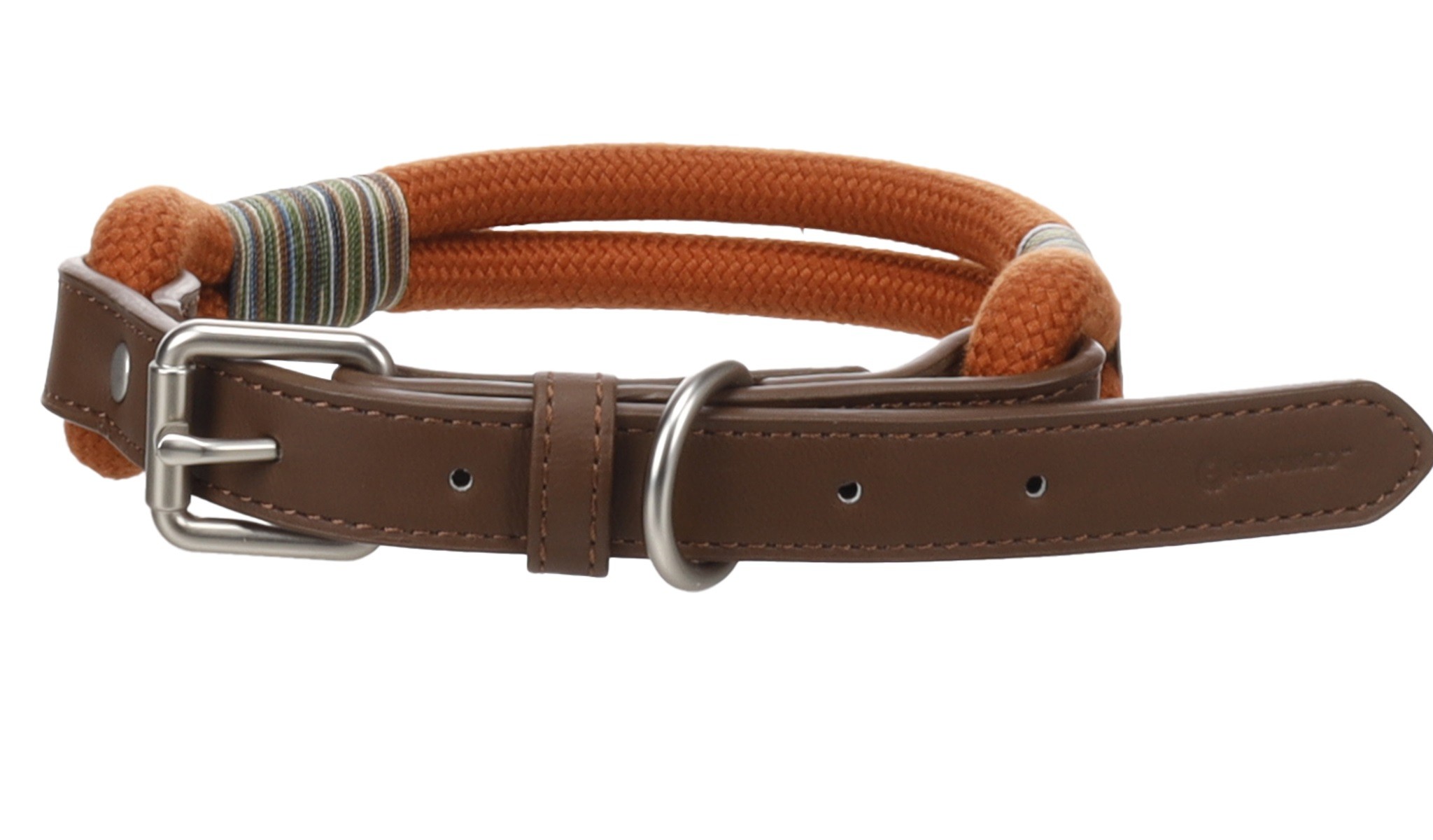 Conçu en similicuir et nylon le collier Athos est agréable à porter tout en offrant une excellente durabilité. Sa sangle résistante est complétée par une corde textile décorative apportant une touche moderne et originale. La boucle solide et l’anneau pour la laisse tous deux dotés d’une finition en métal brossé assurent une fixation fiable et sécurisée.