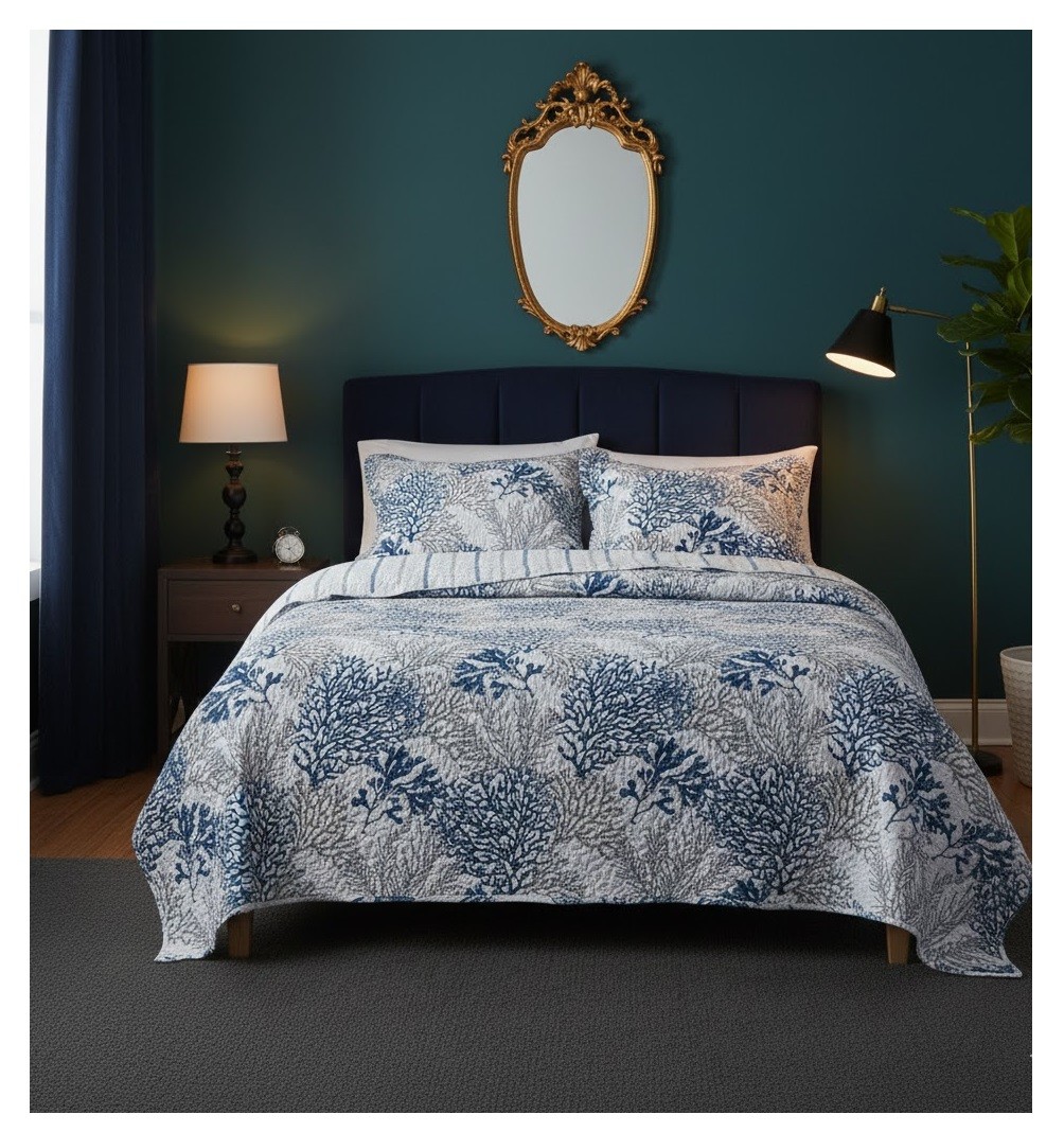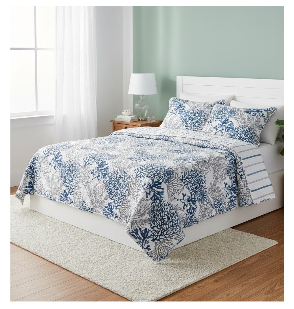 Offrez à votre chambre une ambiance bord de mer avec le couvre-lit Collection Océan 220 x 240 cm et ses 2 taies d’oreiller assorties.