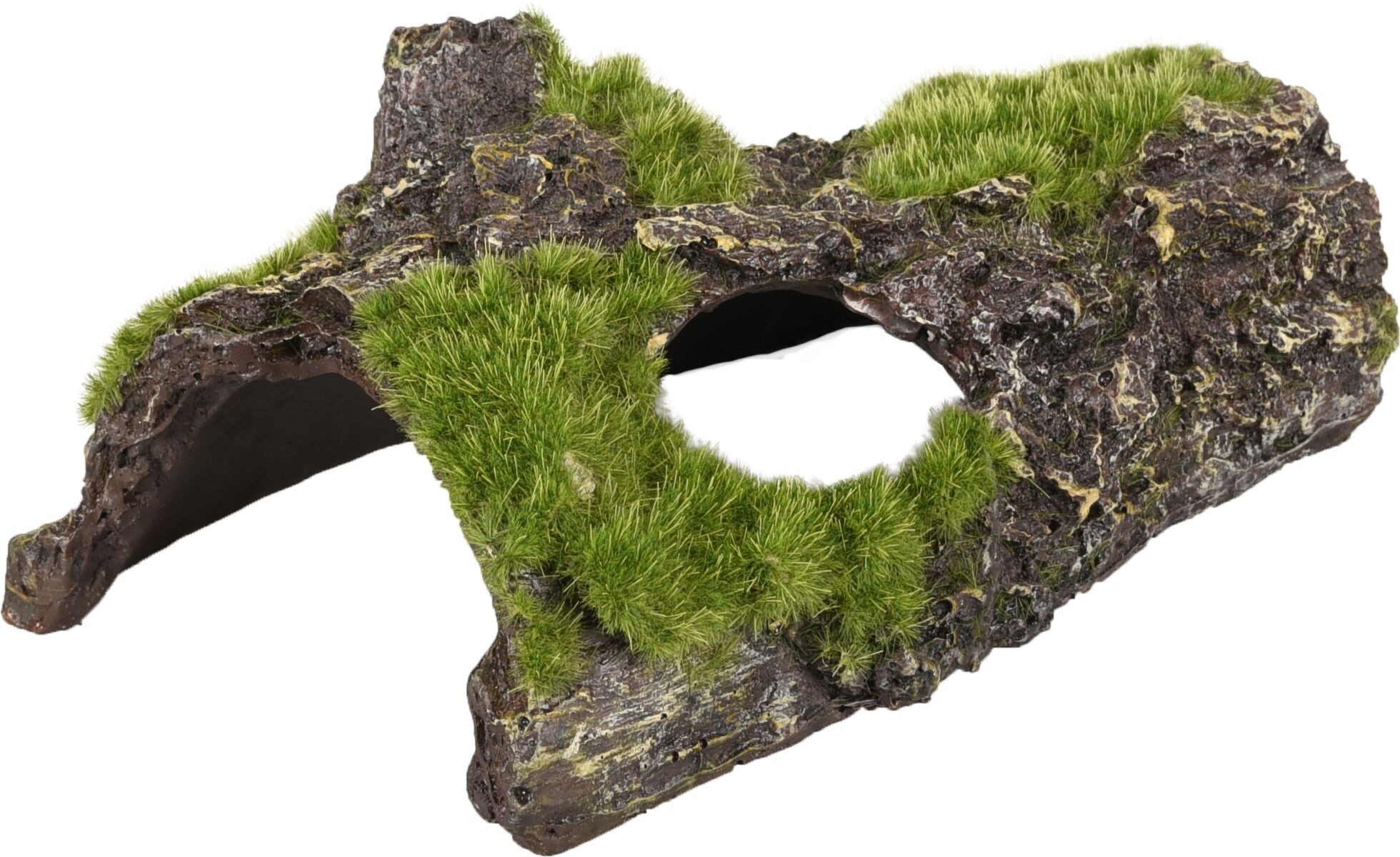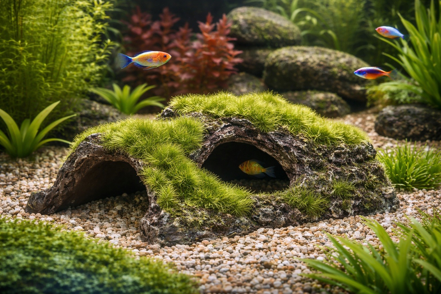 Avec ses reliefs rocheux et ses zones de mousse verte réaliste, ce décor permet aux poissons de se cacher, explorer et circuler librement.