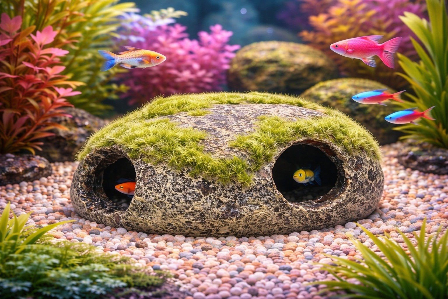 🌿 Décoration aquarium effet galet naturel avec ouvertures et cachette pour poissons. Idéale pour créer un décor apaisant et sécurisant.