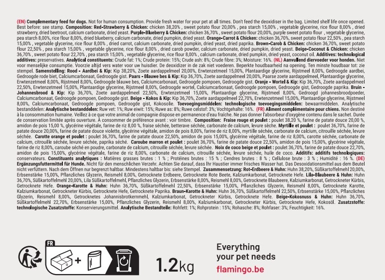 Fraise & Poulet Myrtille & Poulet Carotte & Poulet Caroube & Poulet Noix de coco & Poulet.