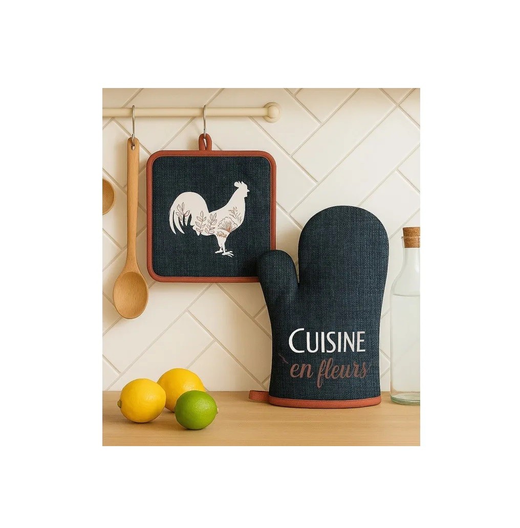 Gant et manique de cuisine Coq et fleurs