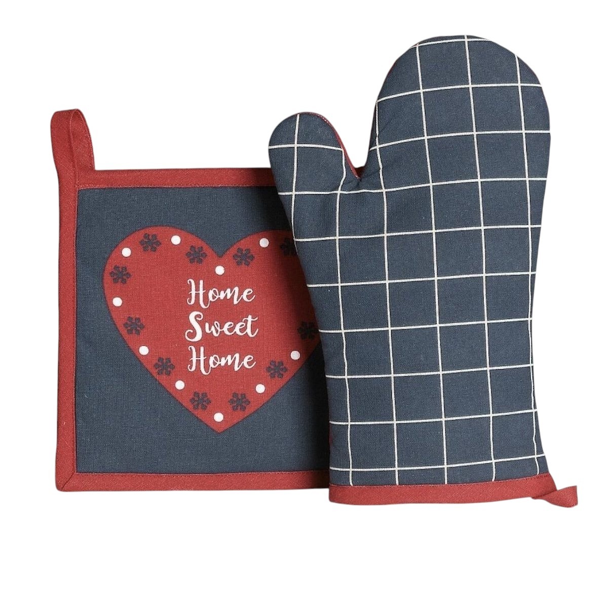 Apportez chaleur et style à votre cuisine ! Gant 20x20 cm + manique 18x18 cm Sweet Home en coton Oeko-Tex, lavables à 40 °C, protection efficace.