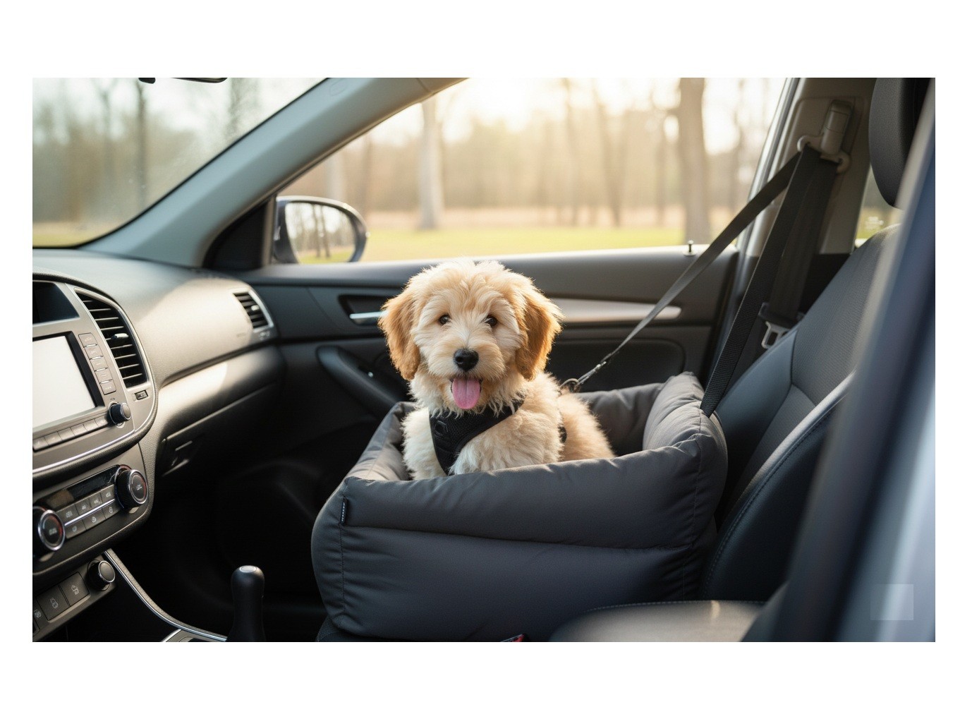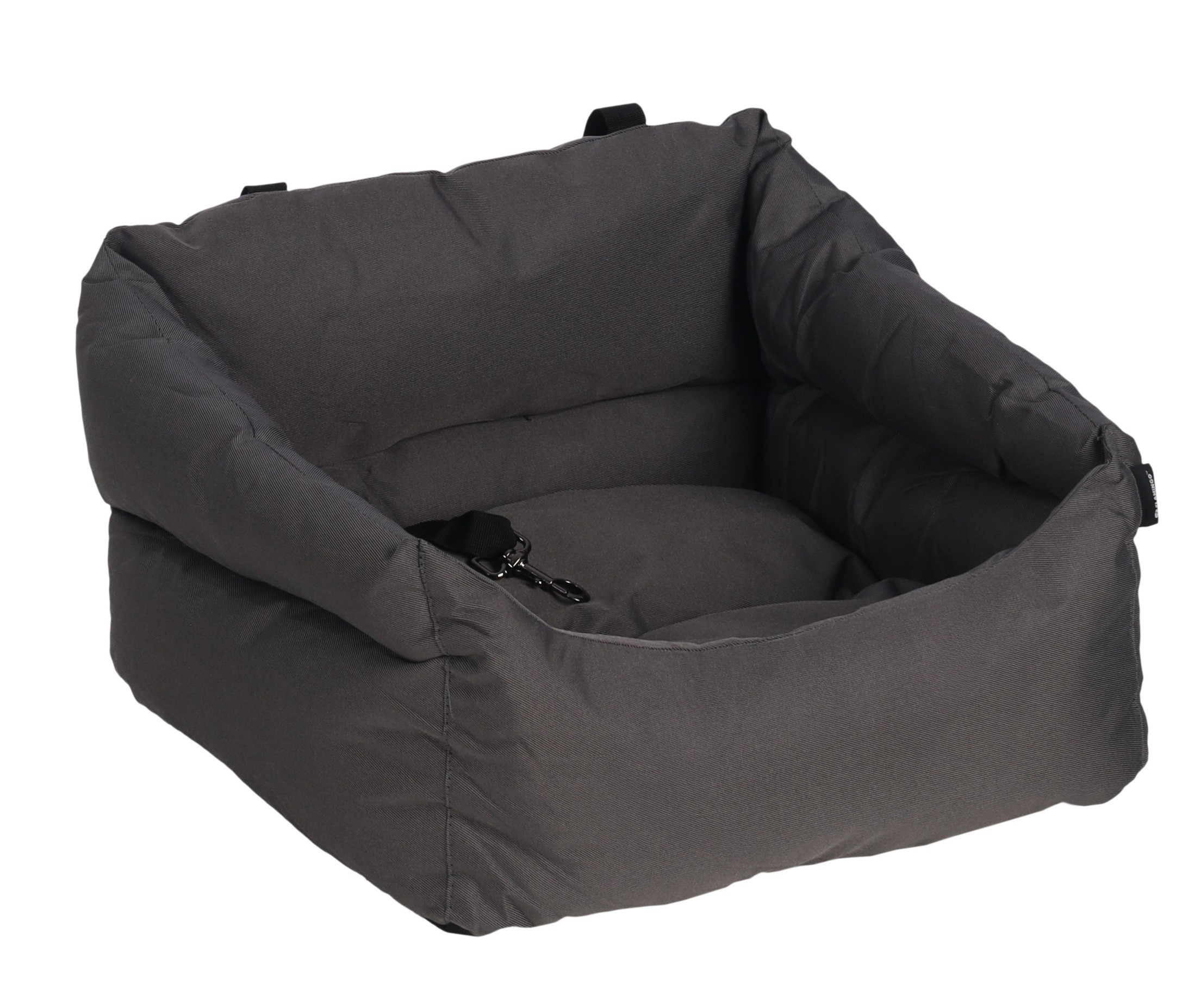 Siège auto pour chien Jangles conçu pour assurer confort et sécurité lors des trajets en voiture. Structure en polyester résistant à l’eau avec rembourrage en fibre de polyester pour une assise stable et confortable.