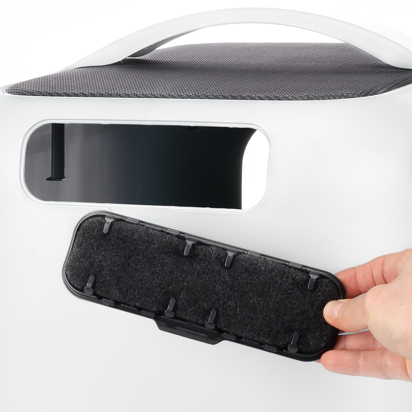 La porte magnétique et le filtre à charbon actif réduisent efficacement les mauvaises odeurs, tandis que le couvercle amovible avec poignée et les encoches intégrées permettent un déplacement simple et sécurisé.
