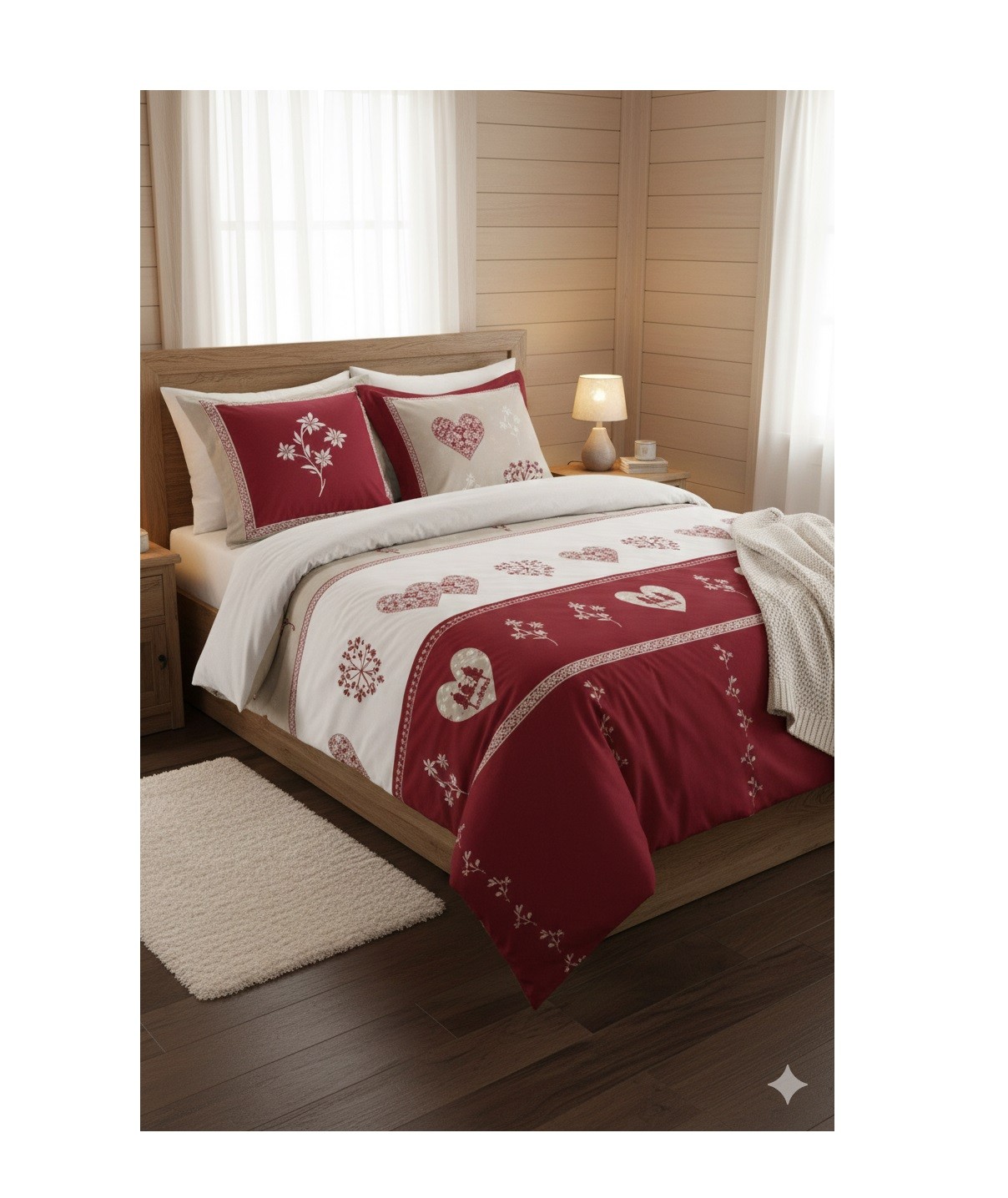 Créez une ambiance chaleureuse et authentique dans votre chambre avec cette parure de lit esprit chalet. Ses motifs cœurs et flocons rouges et beiges évoquent la montagne et les soirées cocooning. Confectionnée en pur coton elle offre douceur confort et un rendu soigné grâce à son dessin placé.