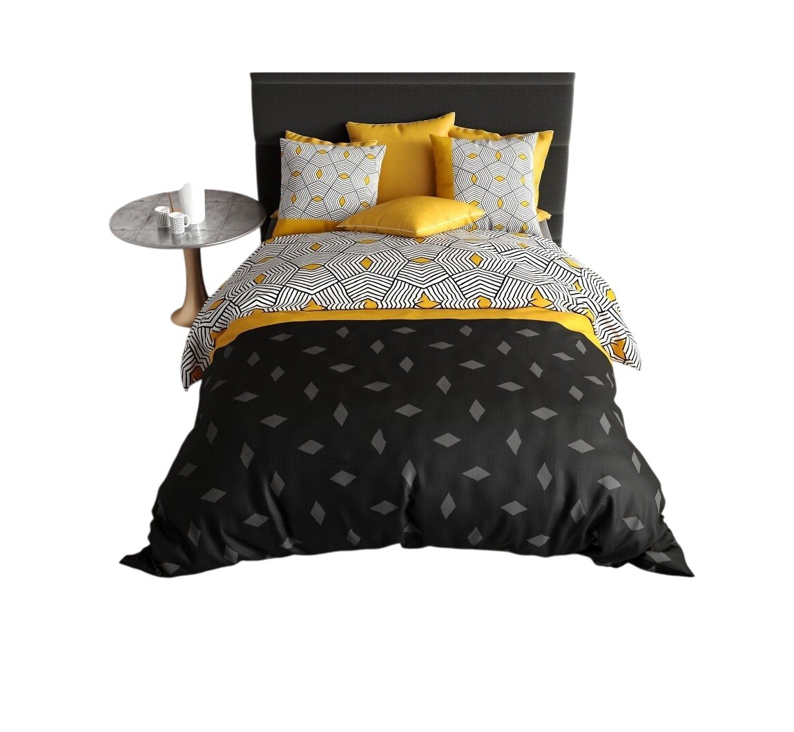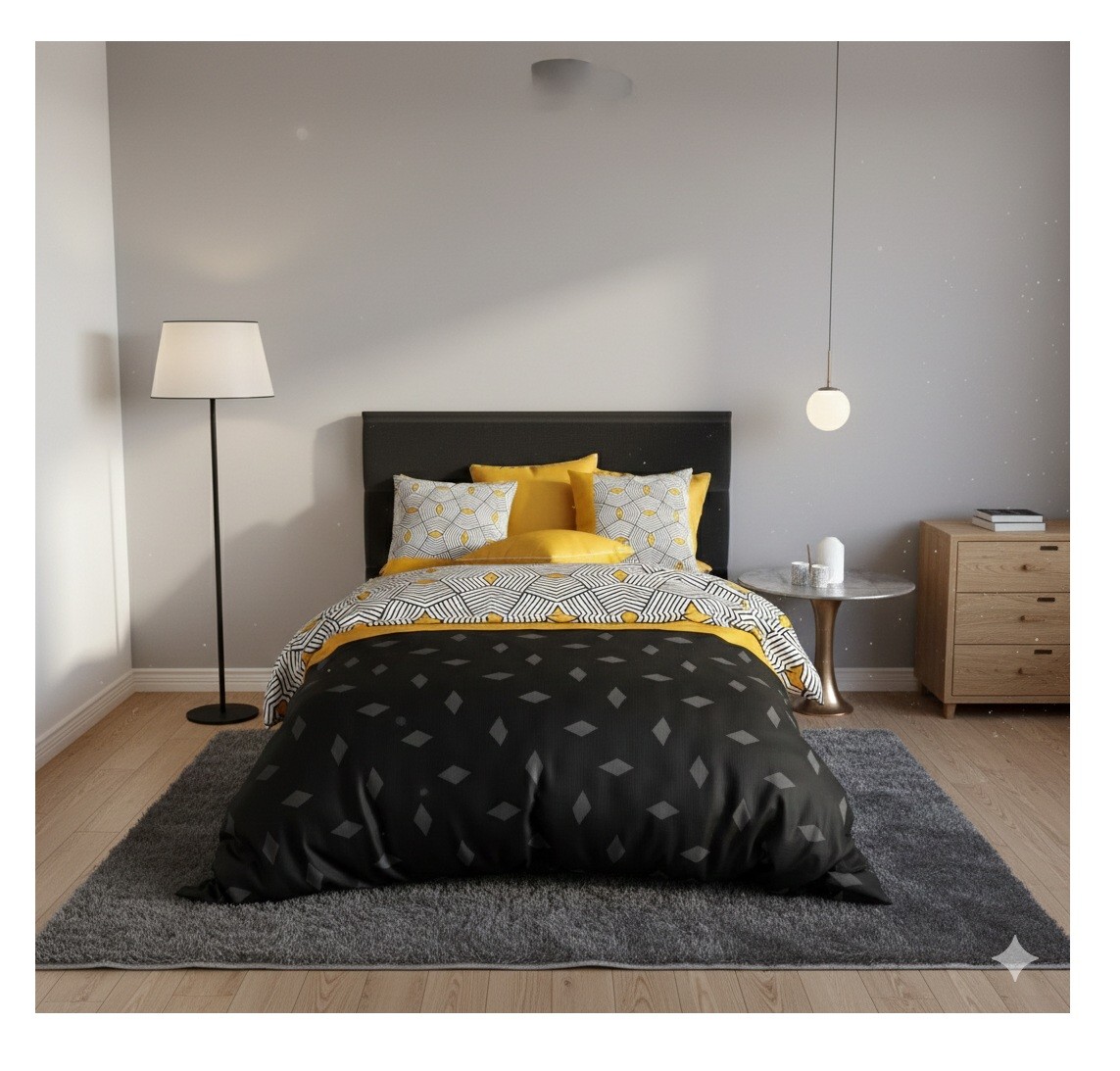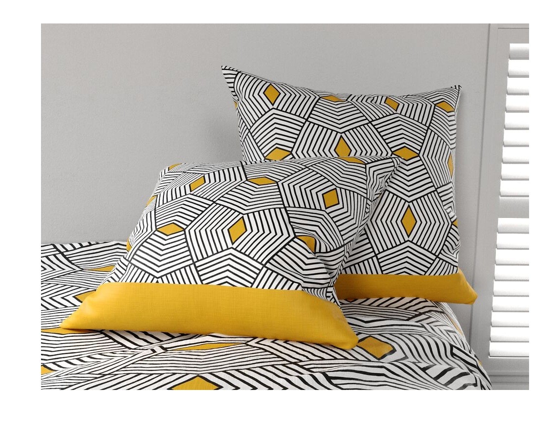 Osez un style moderne et audacieux avec cette parure de lit qui associe des motifs graphiques noirs et blancs à des touches éclatantes de jaune.