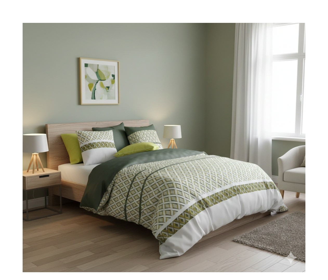 Craquez pour cette parure de lit en coton 220x240 cm au design géométrique et aux tons verts rafraîchissants.