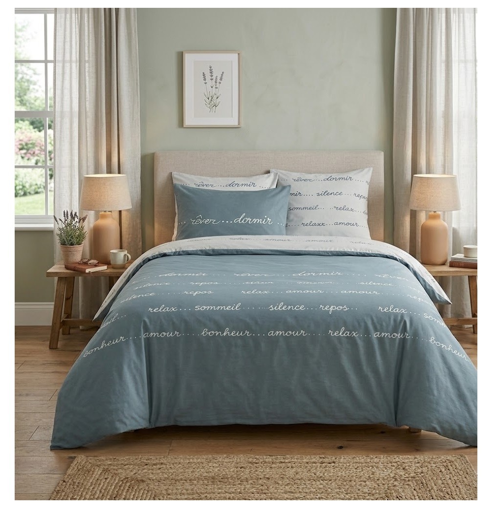 Invitez la quiétude dans votre chambre avec la parure de lit Doux Rêves. Son coloris bleu apaisant et son design élégant créent une atmosphère douce et relaxante idéale pour des nuits sereines.