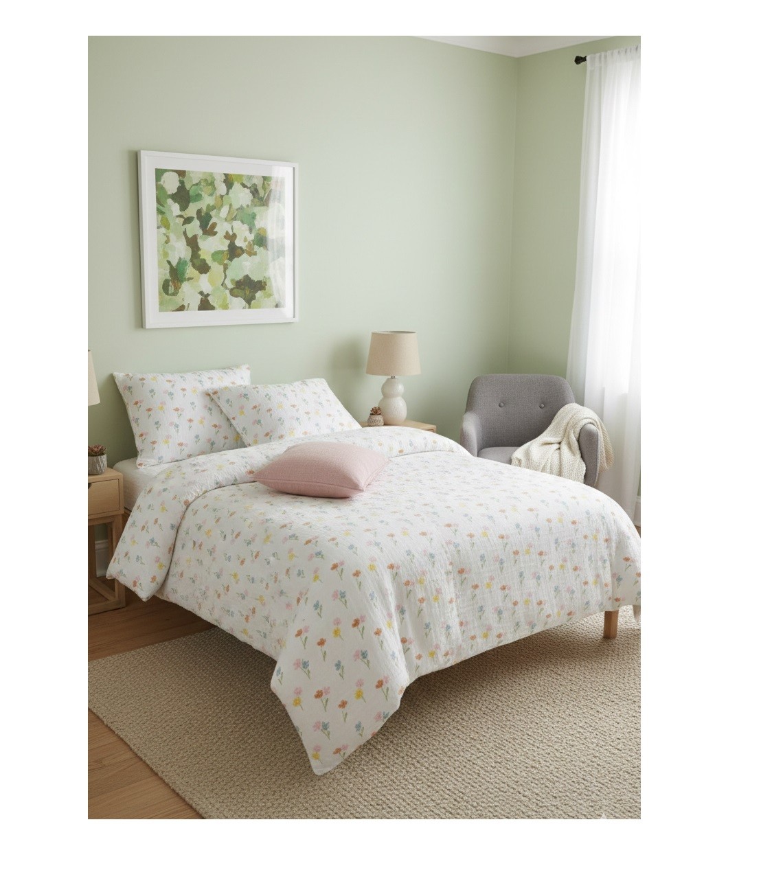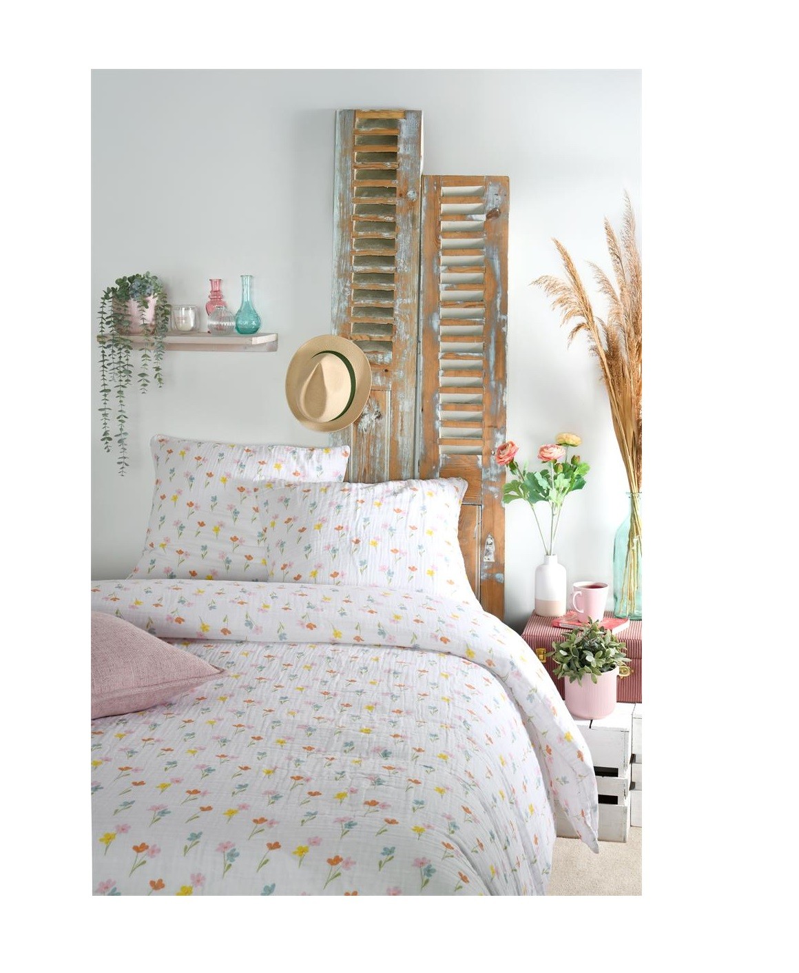Apportez une touche de fraîcheur et de poésie à votre chambre avec cette parure de lit en double gaze de coton 100 % ornée d’un imprimé floral délicat au recto comme au verso.