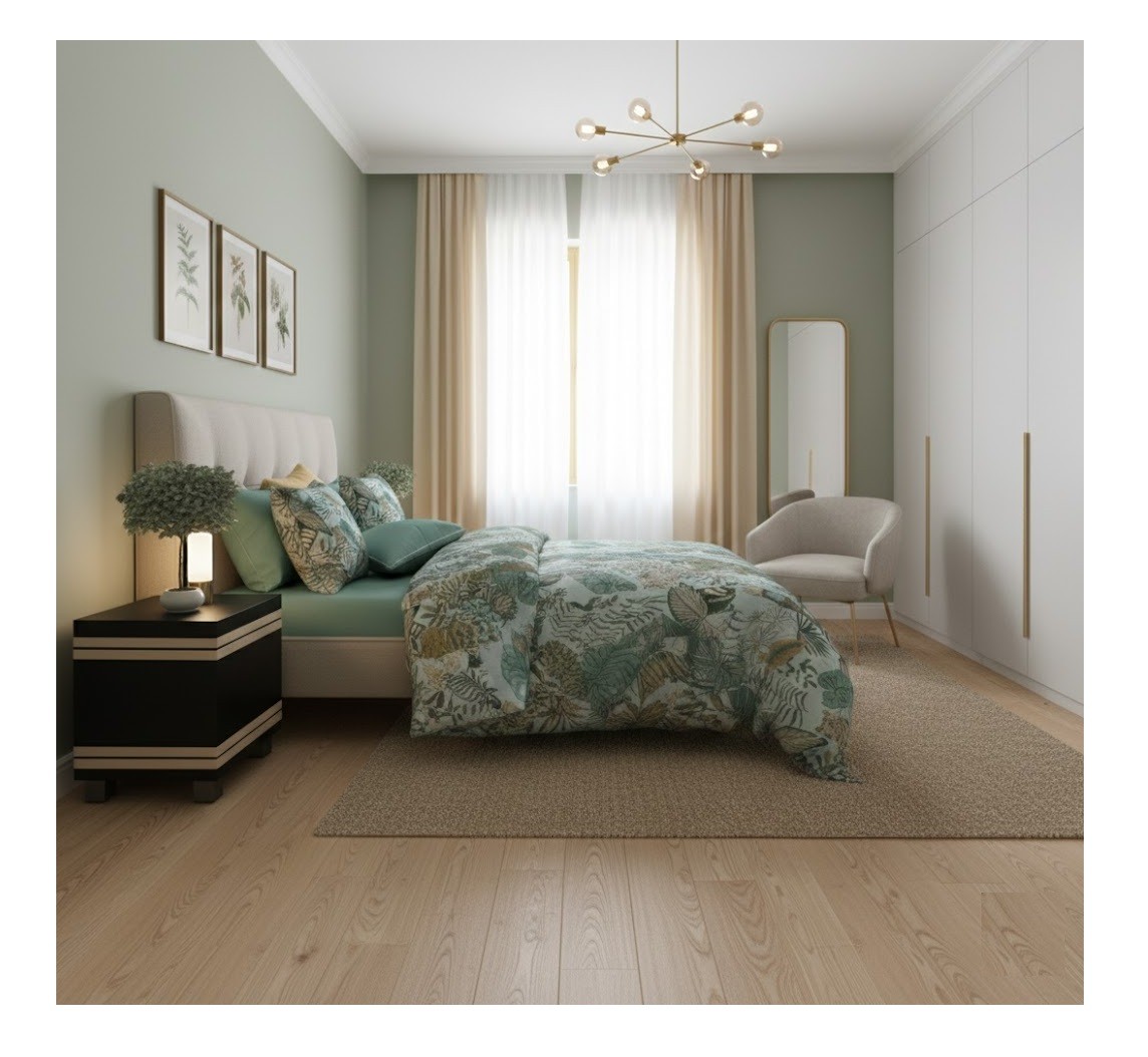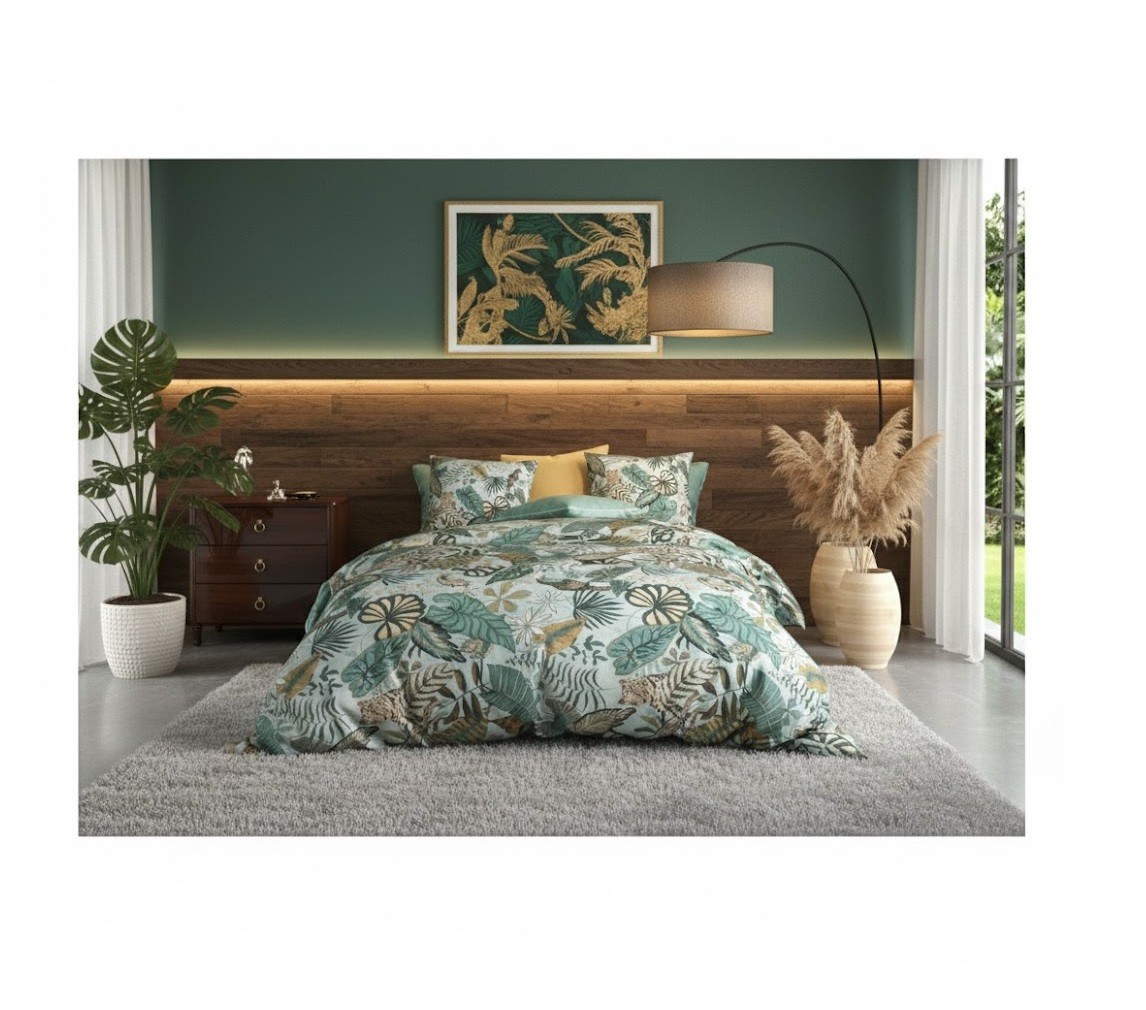 Transformez votre chambre en un véritable havre de fraîcheur avec cette parure de lit en coton au motif tropical raffiné. Ses feuillages luxuriants et ses nuances harmonieuses de vert beige et naturel apportent une ambiance apaisante et contemporaine parfaite pour une décoration moderne ou nature.