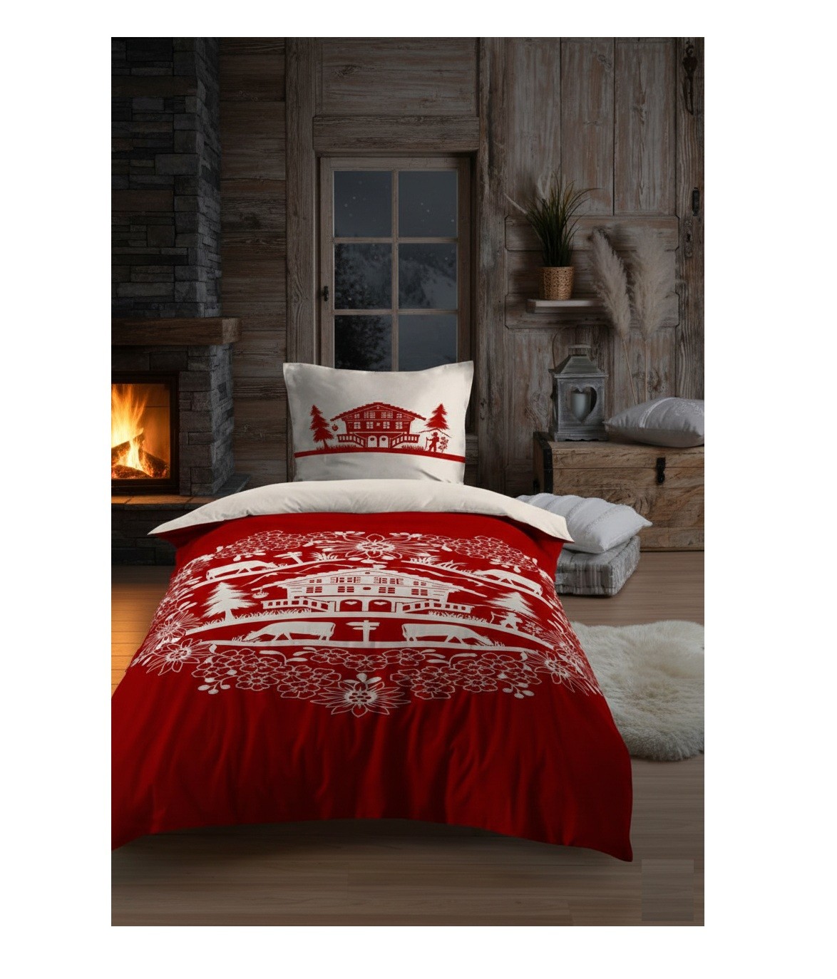 Housse de couette et taie 140 x 200 cm Chalet de Valloire rouge