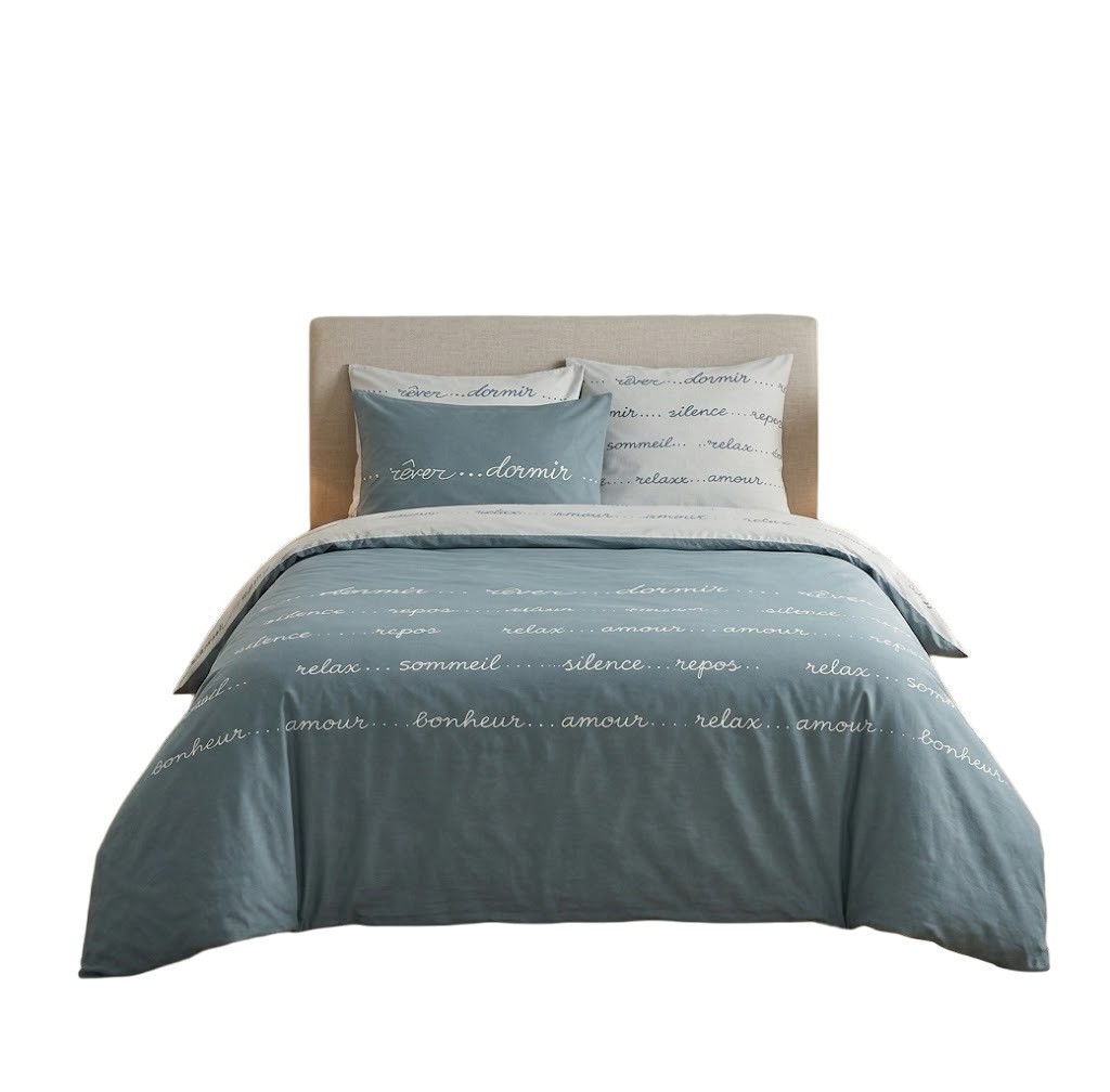 Invitez la quiétude dans votre chambre avec la parure de lit Doux Rêves. Son coloris bleu apaisant et son design élégant créent une atmosphère douce et relaxante idéale pour des nuits sereines.