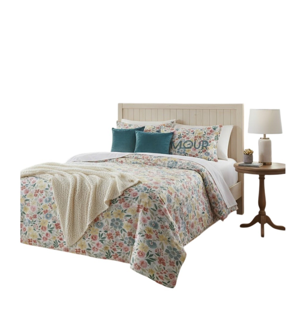 Apportez fraîcheur et douceur à votre chambre avec cette parure de lit en coton ornée d’un élégant motif floral multicolore. Ses fleurs délicates aux nuances de vert jaune corail et bleu créent une ambiance lumineuse apaisante et pleine de charme idéale pour une décoration naturelle et contemporaine.
