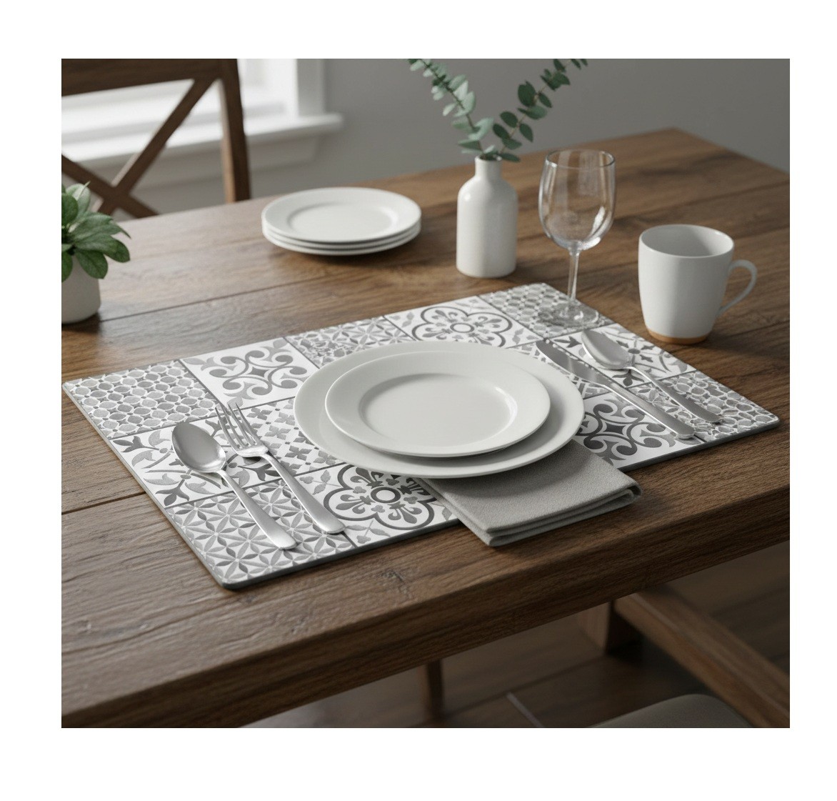 Apportez une touche décorative et moderne à votre table avec ce set de table opaque au motif graphique inspiré des carreaux décoratifs. Son design élégant en noir et blanc structure la table avec caractère et s’adapte facilement à différents styles d’intérieur du contemporain au plus classique.