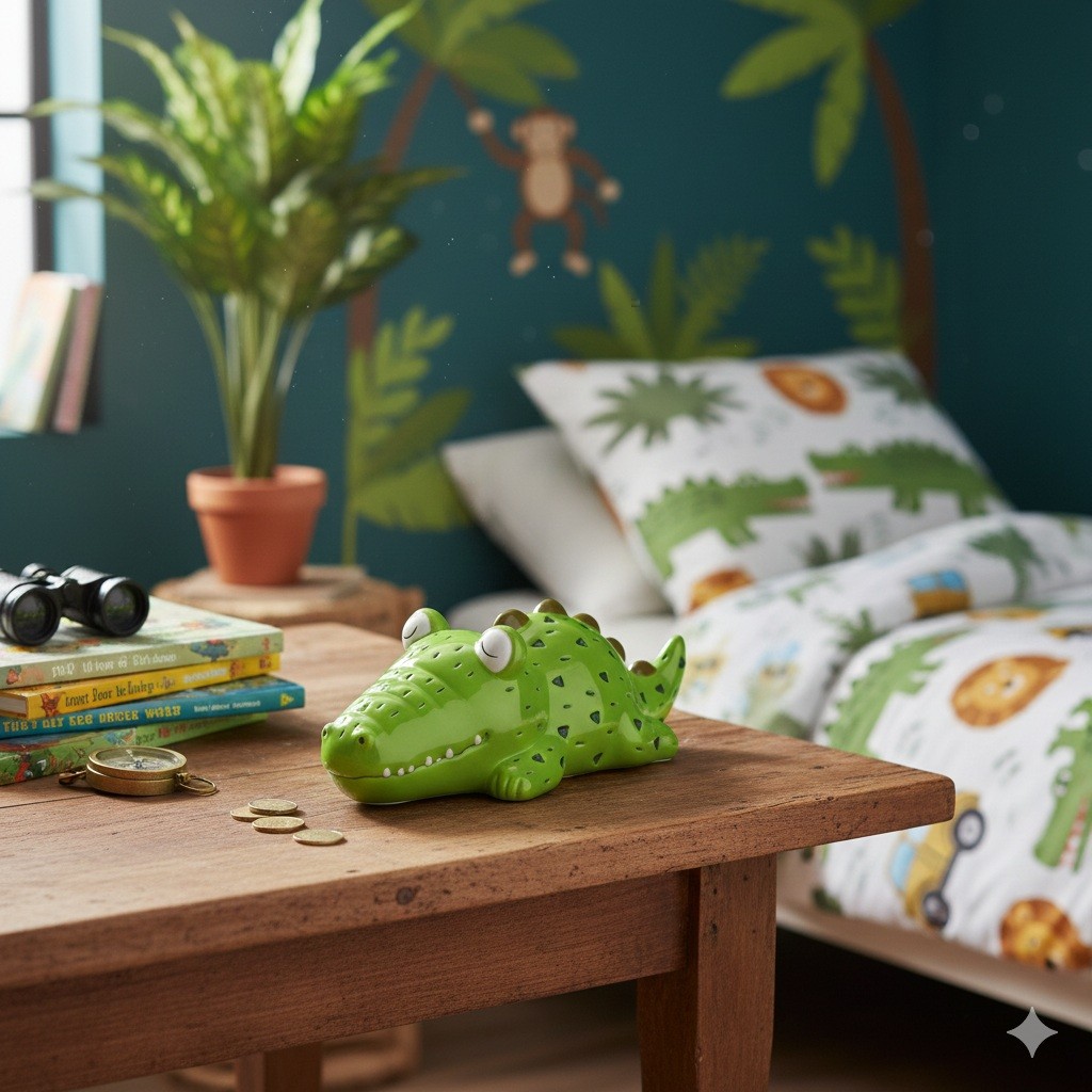 Craquante et pleine de caractère cette tirelire crocodile en céramique apporte une touche ludique et colorée à la décoration. Avec son vert vif ses petits reliefs graphiques et son air malicieusement endormi elle plaira autant aux enfants qu’aux amateurs de déco fun.